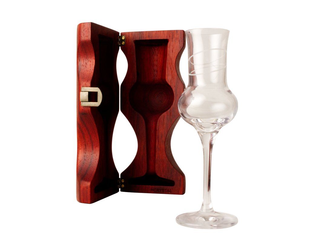 Uvnitř pouzdra s krásnou kresbou dřeva najdete skleničku, jako stvořenou na degustaci pálenky. Sklenička má objem 90ml a má decentní brus.