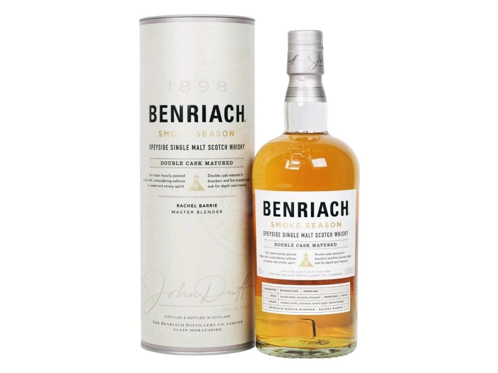 Benriach Smoke Season je intenzivně uzená malosériová verze, která oslavuje sladkou rašelinu z palírny Speyside. Smoke Season, vytvořený ze 100% rašelinového sladu, dvakrát zrál v sudech z amerického panenského dubu a bourbonu a lahvoval na 52,8 % abv. Velkolepé věci. Ve vůni je pomerančová kůra, čokoláda a bohatý karamel. Chuť je dekadentně vrstvená sladkostí z panenských dubových sudů, s tmavou vanilkou a dušeným jablkem, vedle suchého dubu, dřevitého kouře a jemného koření. Závěr je ořechový s dochutí kouřového pepře. Palírna Benriach byla založena Johnem Duffem a jeho dvěma společníky v r. 1898, stejně jako o rok dříve sousední Longmorn. Již v r. 1900 však Duff musel obě palírny z finančních důvodů prodat. Nový majitel, Longmorn Distillery Co Ltd., vzápětí palírnu Benriach zavřel. V provozu zůstala pouze sladovna vyrábějící slad pro Longmorn. V r. 1965 palírnu koupila společnost The Glenlivet Distilleries Ltd., uvedla do provozu a v r. 1977 opět prodala společnosti Seagram. Ta instalovala druhou dvojici kotlů a r. 1994 uvedla na trh první single malt whisky Benriach. V r. 2001 palírnu koupila společnost Chivas a v r. 2002 ji opět zavřela. V r. 2004 byla palírna prodána jihoafrické společnosti Intra Trading, která ji znovu uvedla do provozu.V palírně se vyrábí 10-letá single malt whisky. Je také součástí míchaných whisky, např. Chivas Regal, Something Special, Queen Anne a dalších.Doplňkové parametry