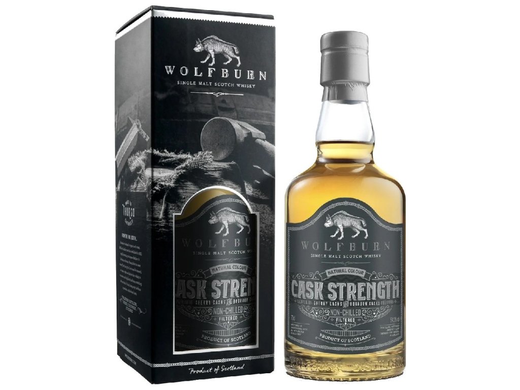 Wolfburn Cask Strength je limitovaná malá dávka, která byla ponechána zrát jen něco málo přes 7 let v Oloroso Sherry Butts a ex-Bourbon Quarter Casks a je k dispozici v sudové síle 56,9 %. Tyto malé sudy zajišťují velmi výraznou a zároveň mnohostrannou whisky, která zaujme svými mnohostrannými aromaty. Vůně: Svěží aroma bourbonu je zmírněno sladkou esencí sherry. Prostupuje nádech karamelu a karamelu a zapůsobí komplexním buketem. Chuť: Čokoládové lanýže se snoubí se sladkým karamelovým pudinkem a čerstvým piškotovým dortem. Chuť je pak úžasně obalená jemnými náznaky rašelinového kouře. V každém ohledu se jedná o velmi bohatou a plnou single malt whisky. Závěr: Lahodná karamelová sladkost je doprovázena nádechem karamelu a cukru Demerara. Nádech rašelinového kouře zůstává až do konce a zajišťuje krásnou, dlouhotrvající dochuť.Doplňkové parametry